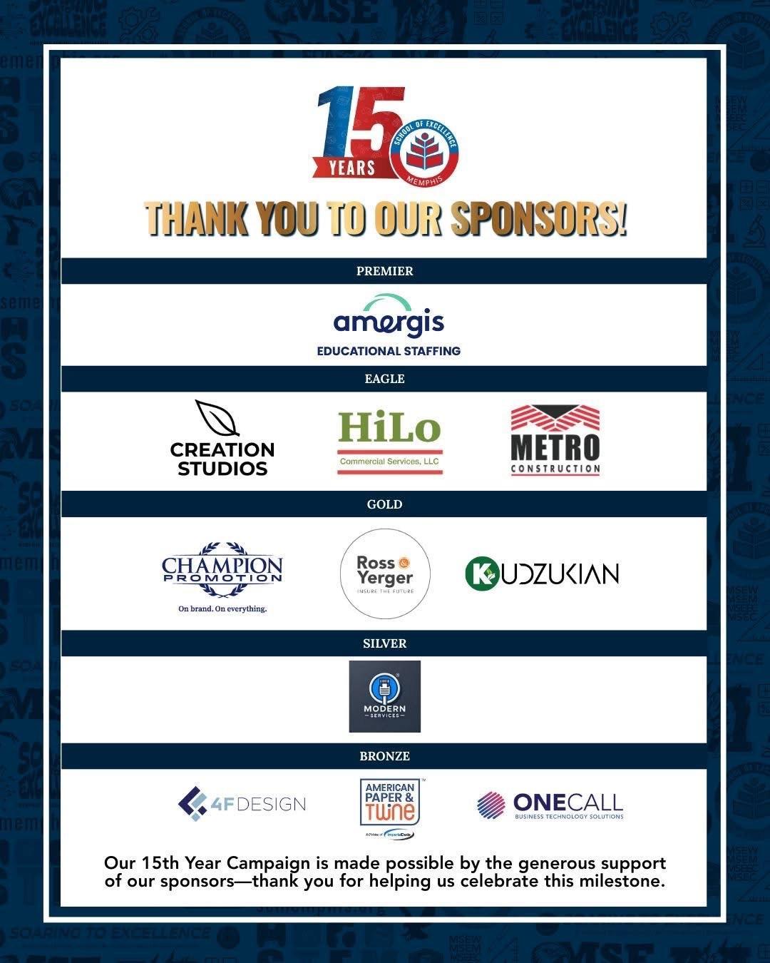 We’re so thankful for the incredible sponsors and donors who have supported Memphis School of Excellence’s 15th Year Campaign. Your generosity helps us honor our journey, uplift our students, and keep building a stronger future for our school community. Thank you for being part of this milestone and for standing with us every step of the way.